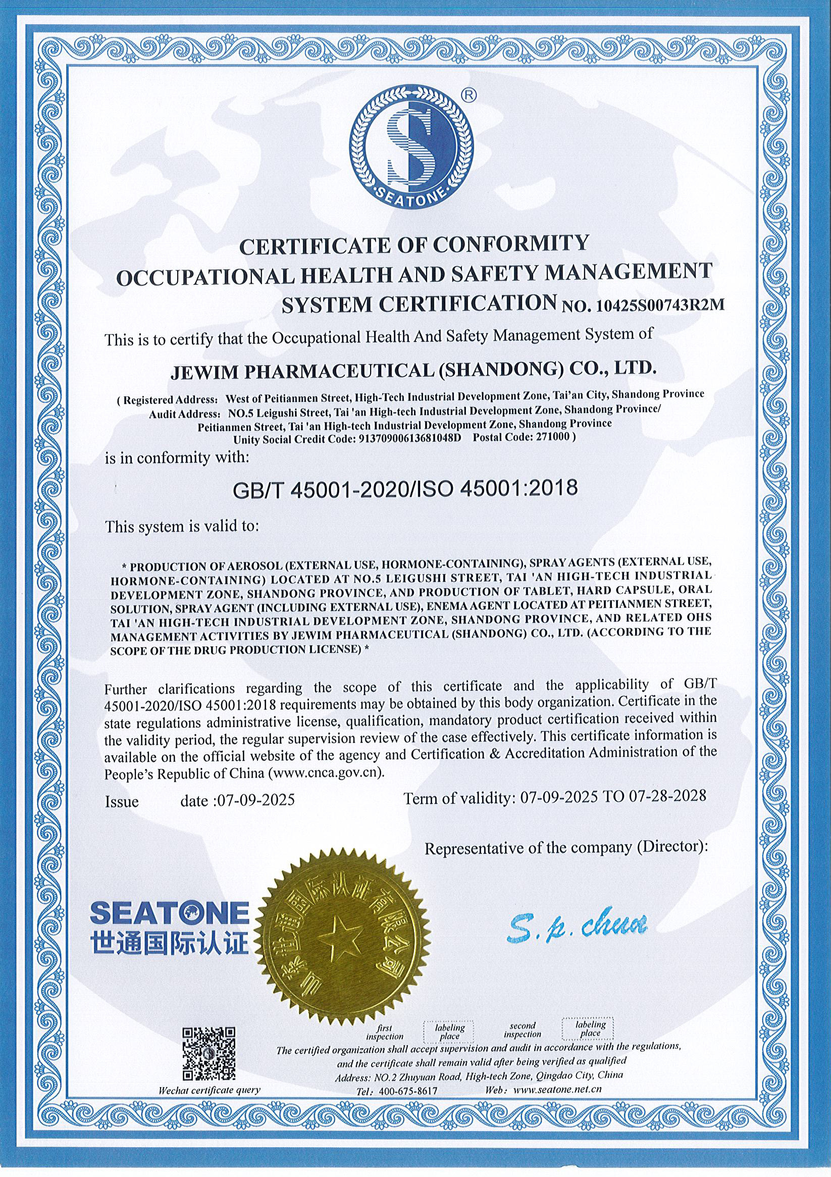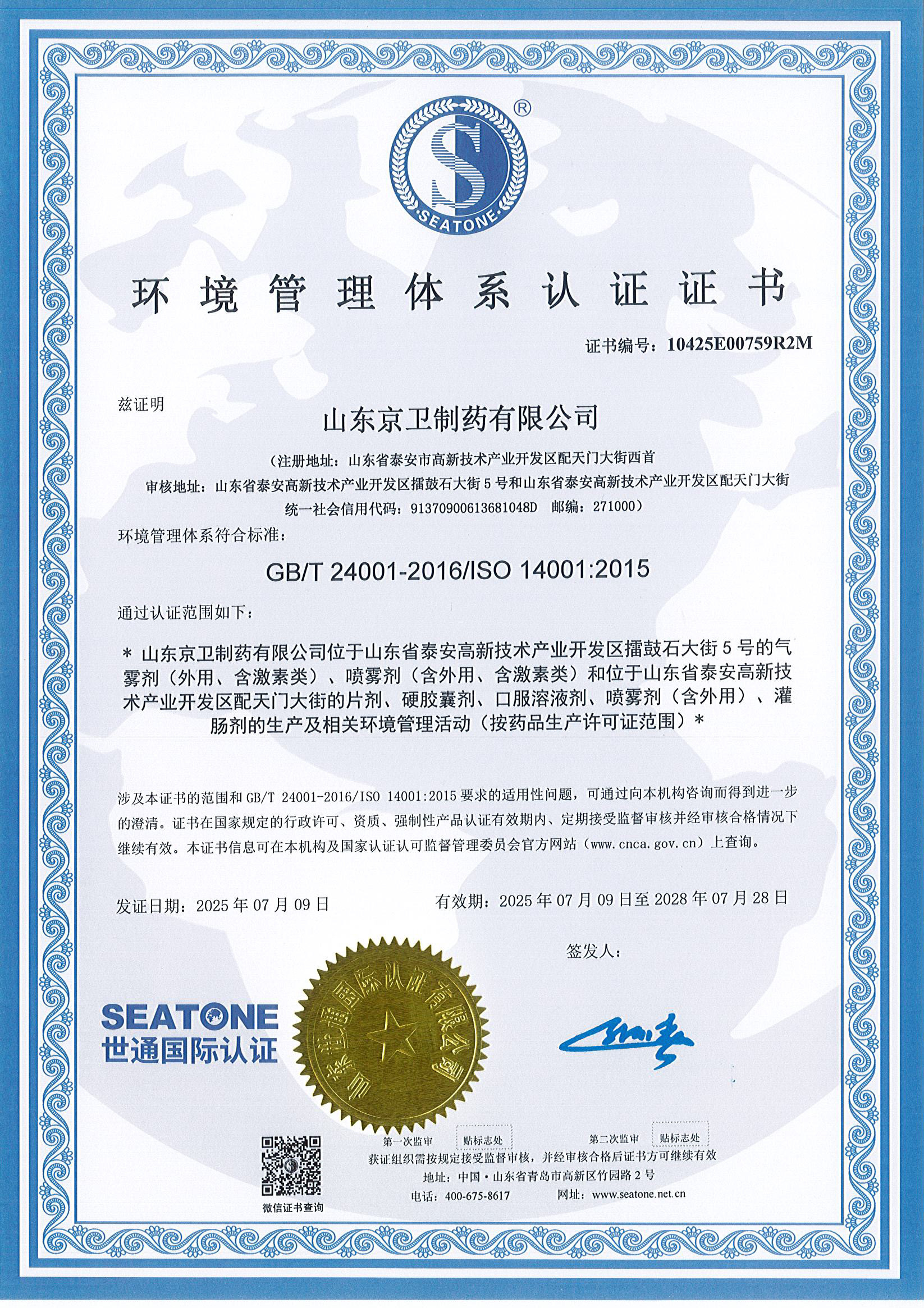 公司建立了完善的EHS管理体系。2010年5月,公司在医药行业率先通过ISO14001环境管理体系和ISO45001职业健康安全管理体系的国际认证,并连续14年通过复认证。公司为泰安市“绿色标杆示范企业”、“安全生产应急管理规范化示范企业”。