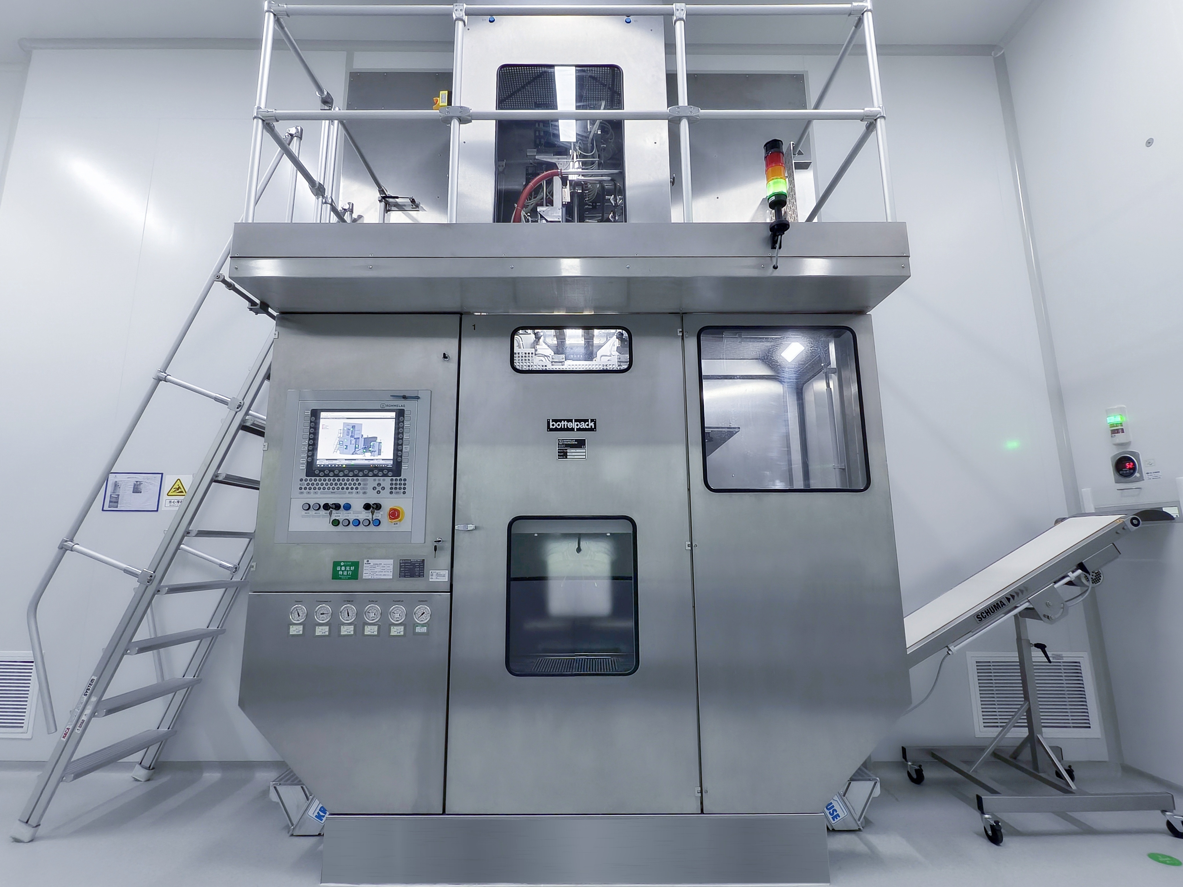 瑞士Rommelag BFS一体机(460/321型):集制瓶、灌装、封口为一体,可实现全自动CIP、SIP,无菌保障程度高、粒料损耗小,外观均一、装量稳定。